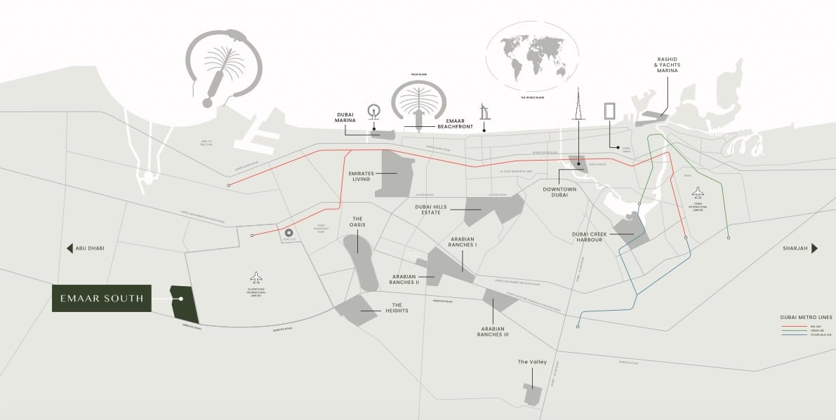 Emaar South is located within Dubai South, close to Al Maktoum International Airport and near Expo City Dubai. The location places Emaar South projects within Dubai’s southern growth corridor, with direct access to major highways connecting to key destinations across the city.